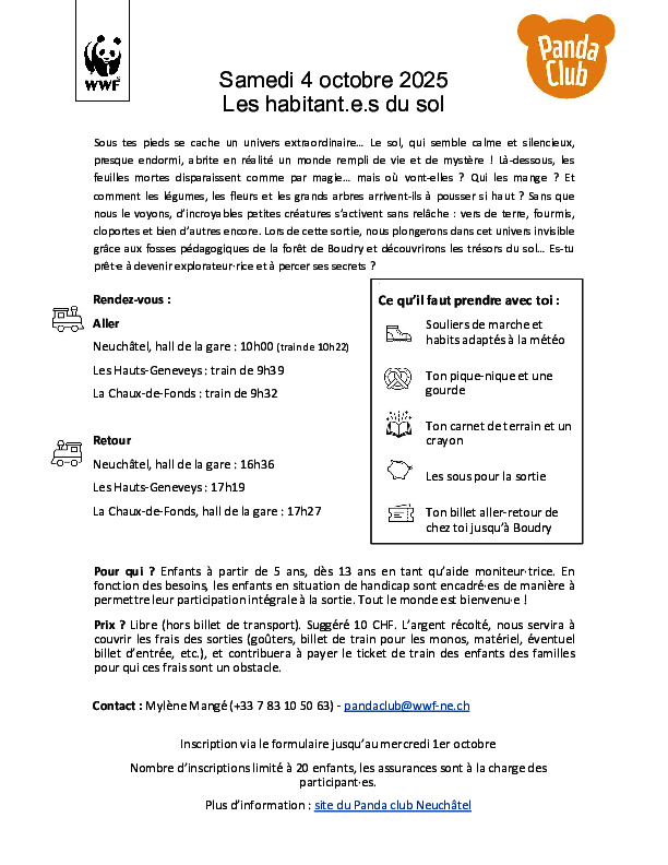 Les inscriptions aux sorties Panda Club du WWF Neuchâtel se font désormais sur une nouvelle plateforme, il vous suffit de cliquer sur les liens correspondant aux sorties de votre choix.